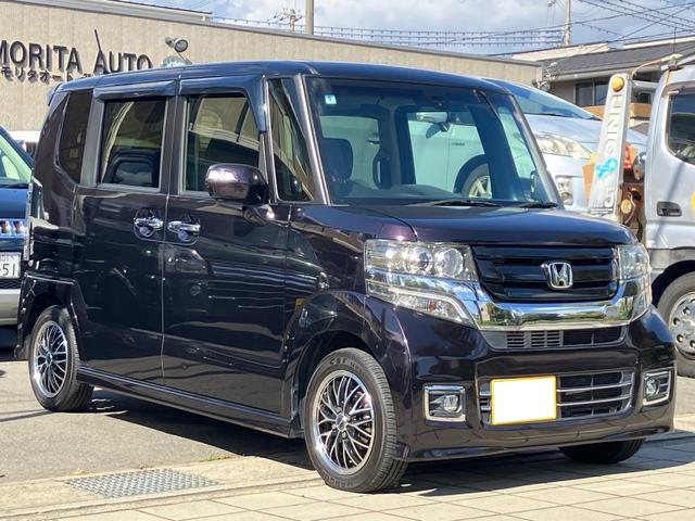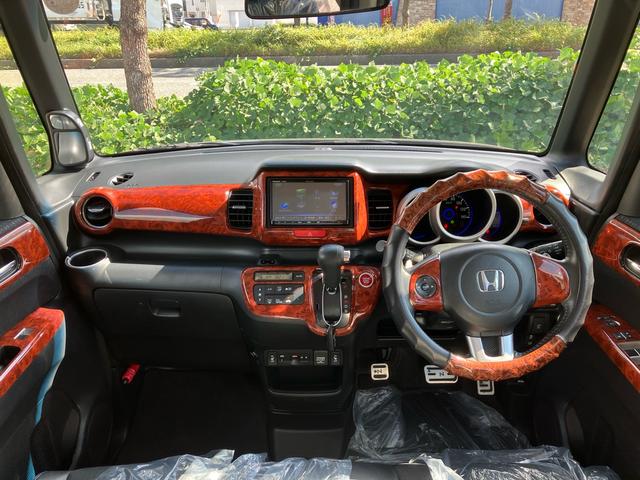 ホンダ N-BOXカスタムG ターボSSブラックスタイルパッケージ ナビ CD DVD バックカメラ Bluetooth接続 ブルーステッチハーフレザーシート ウッド調 パネル 内装 オートクルーズコントロール シートヒーター ETC 社外ホイール