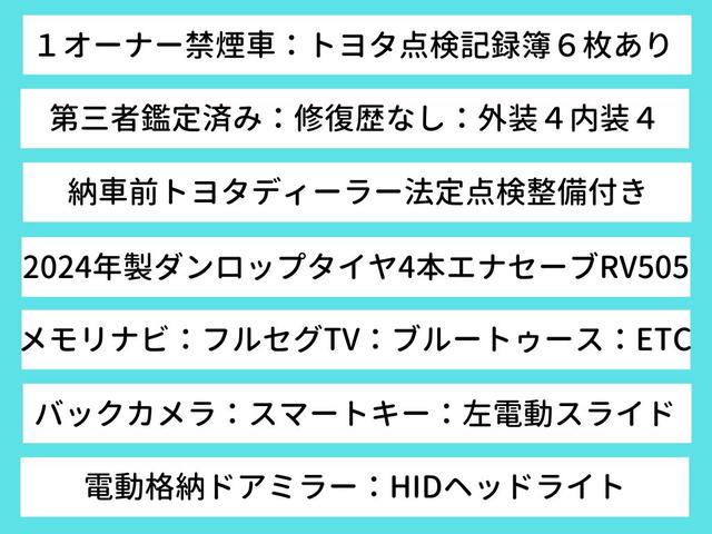 G 1オーナー禁煙車・トヨタ記録簿6枚・2024年製タイヤ4本・メモリナビ・フルセグTV・ブルートゥース・バックカメラ・ETC・左電動スライドドア・スマートキー・電動格納ドアミラー・HIDヘッドライト