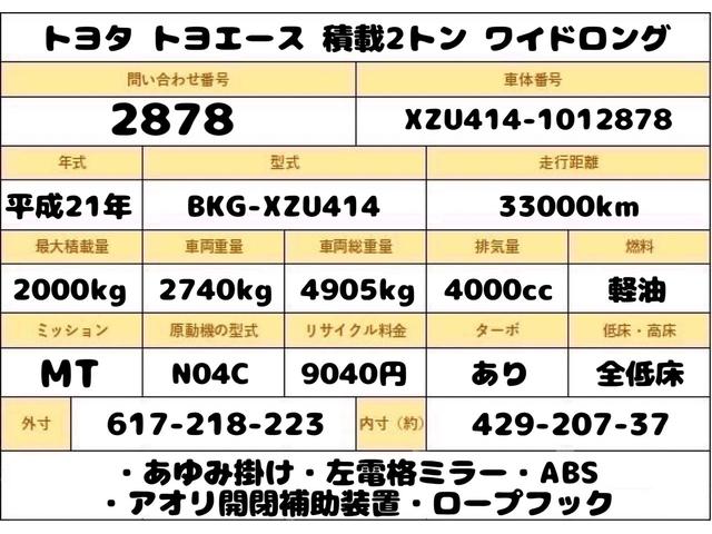 トヨタ トヨエース2トン ワイドロング 全低床 MT 荷寸429-207-37 あゆみ掛け 左電格ミラー アオリ開閉補助装置 ロープフック 2トン車 6速MT 架装 2トン平 平車 2トンワイド 2トンロング 136馬力 1ナンバー 地上高90cm 中古トラック 中古車