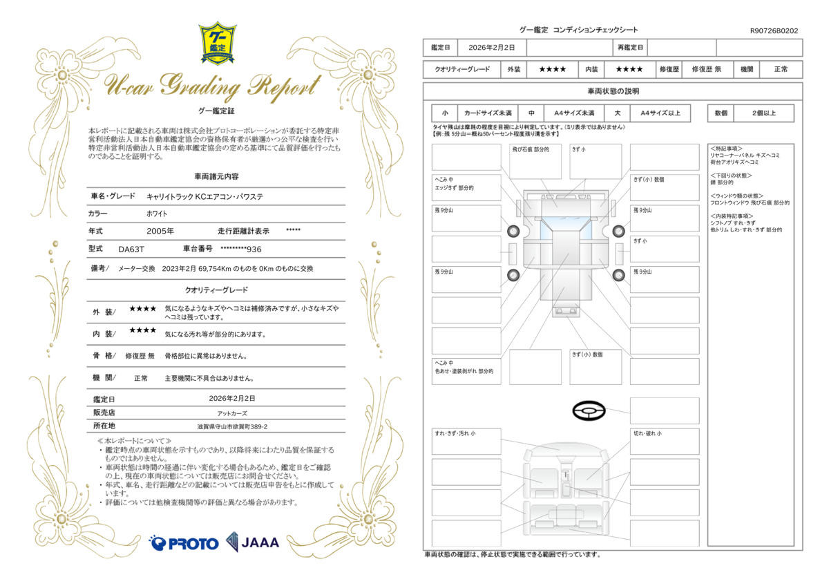 | 内容 | 1年間走行距離無制限にてエンジン関係、ステアリング機構、動力伝達機構/前後アクスル機構、ブレーキ機構の52項目の保証修理をさせていただきます。1年2年3年のJU保証もご用意させていただいております。 |