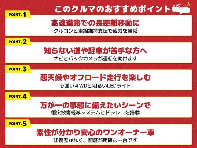 1.高速道路での長距離移動に、2.知らない道や駐車が苦手な方へ、3.悪天候やオフロード走行を楽しむ、4.万が一の事態に備えたいシーンで、5.素性が分かり安心のワンオーナー車