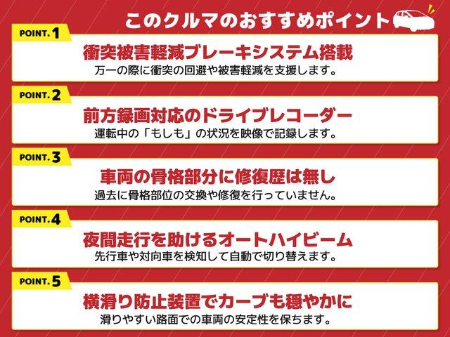 1.衝突被害軽減ブレーキシステム搭載、2.前方録画対応のドライブレコーダー、3.車両の骨格部分に修復歴は無し、4.夜間走行を助けるオートハイビーム、5.横滑り防止装置でカーブも穏やかに