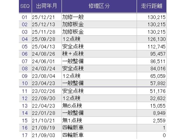 | 走行距離 | 13.0万km | 修復歴 | なし |