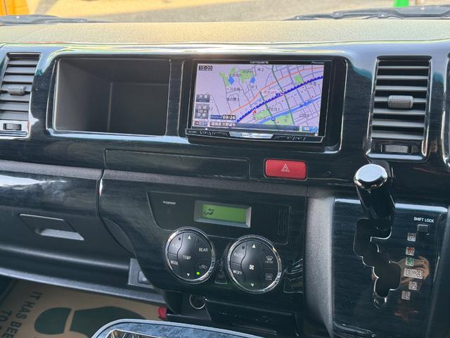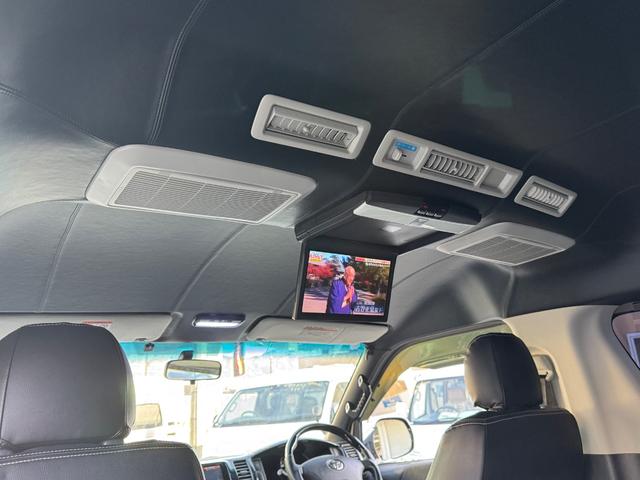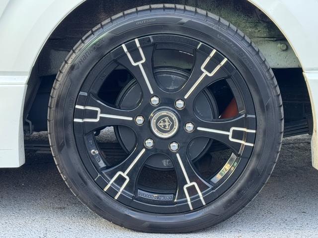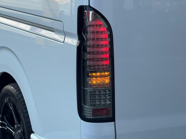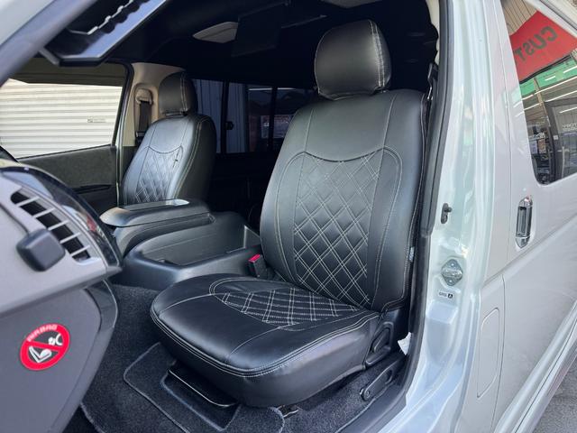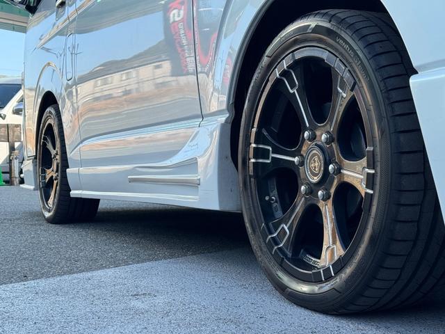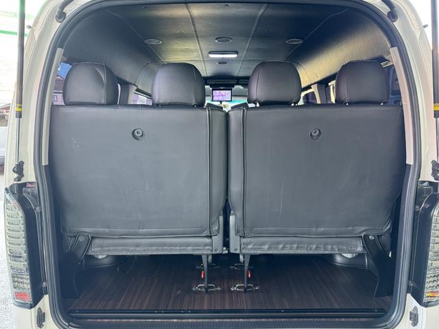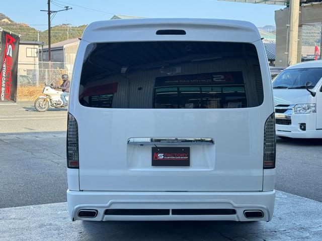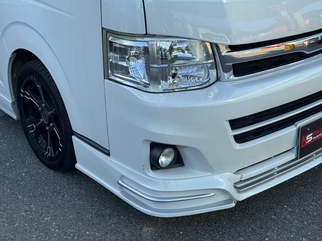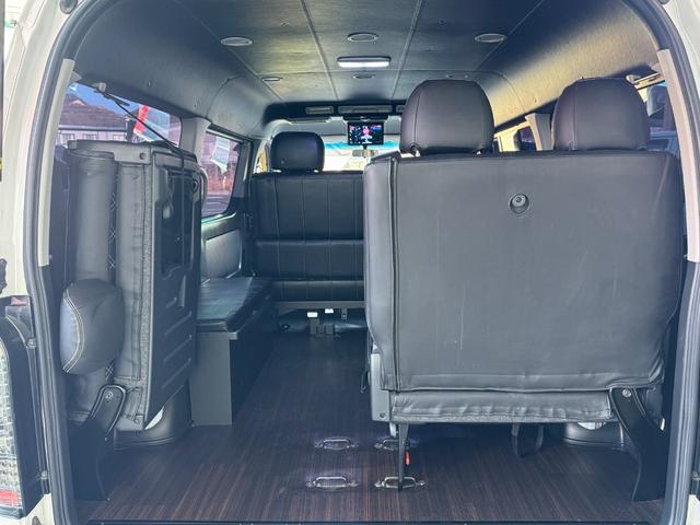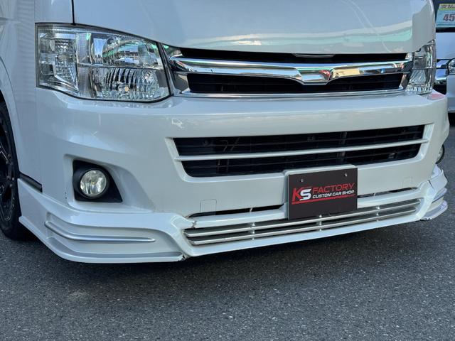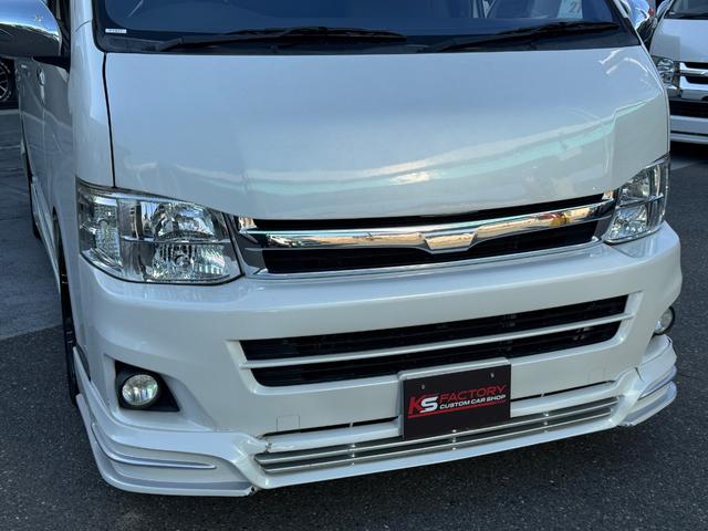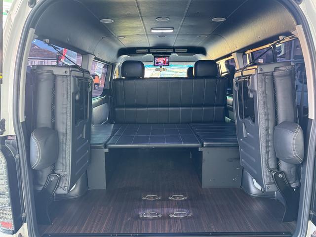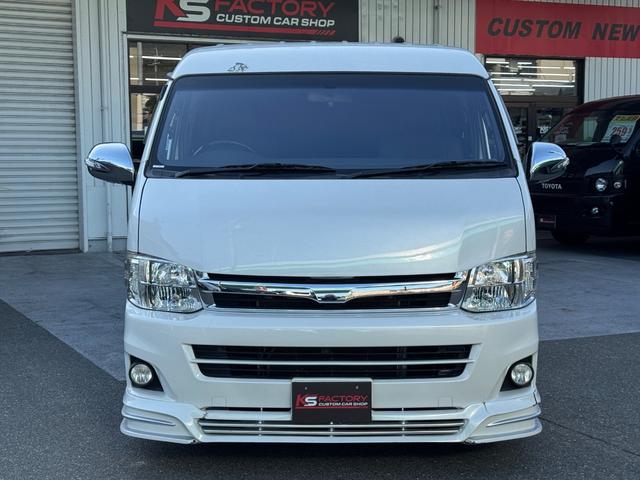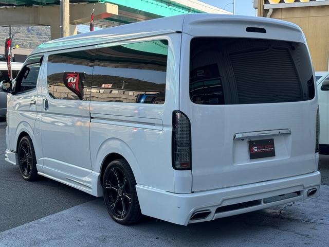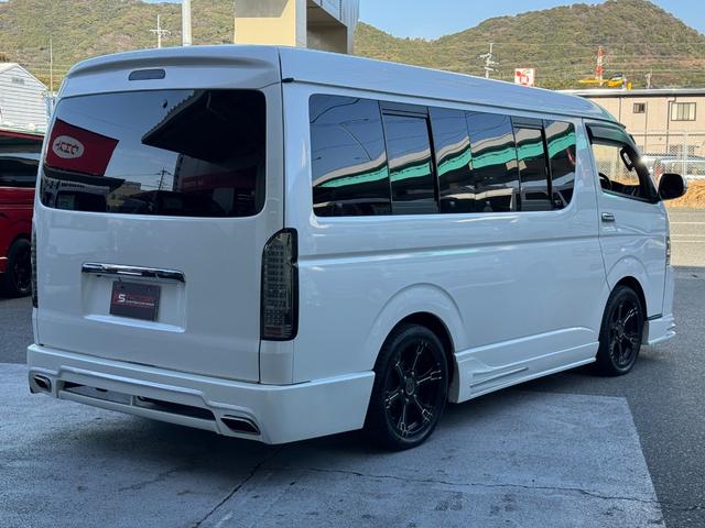 トヨタ ハイエースワゴンGL 10人乗り/フルフラットベッド/パワースライドドア/フルエアロ/天井レザー張り/社外ボンネット/ローダウン/社外ショックアブソーバー/ハーツ18AW/中古カスタム/リアスポイラー/フローリング施工