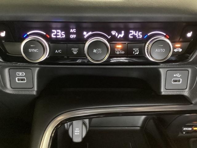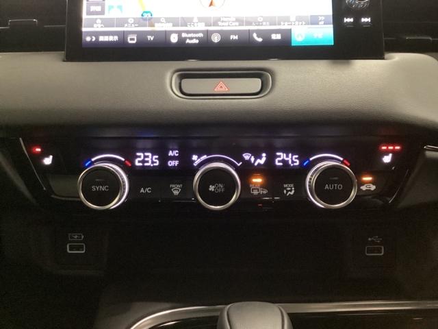 オートエアコンがついてます。左右独立で温度設定のできるデュアルオートエアコンです。パネル内のシートヒータースイッチは前席の左右別々に3段階で温度設定ができます。