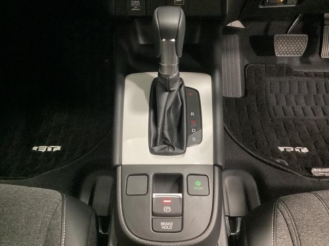 CVT車のセレクトレバーです。低速から高速まで、変速ショックのないスムーズな走りと、エンジン効率のよい領域を維持して燃費にも貢献します。サイドブレーキはスイッチ操作の電子制御パーキングブレーキです。