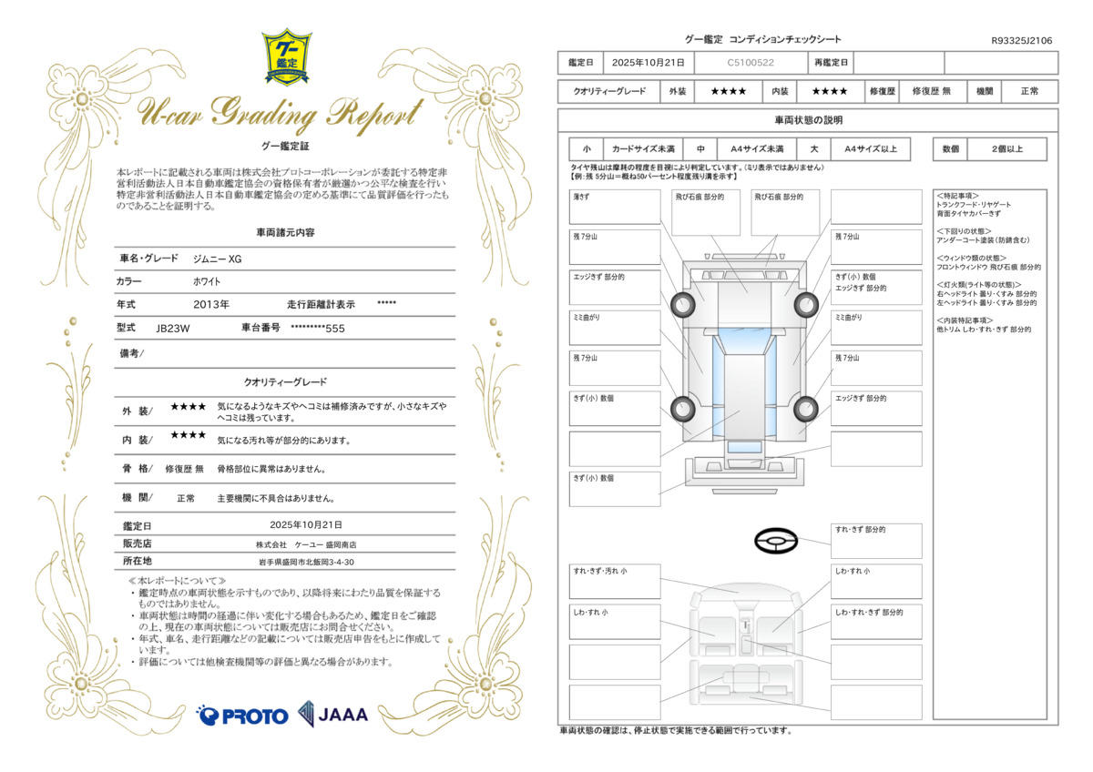 当社の展示車は全車両に”社団法人自動車公正取引協議会”の車両状態説明書を掲示しております。修復歴の有無はもちろん、ドア等の外板の交換歴の有無までも表示☆口頭説明ではなく書面にてお渡ししております♪