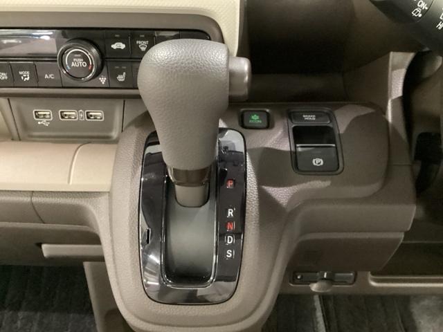 CVT車のセレクトレバーです。低速から高速まで、変速ショックのないスムーズな走りと、エンジン効率のよい領域を維持して燃費にも貢献します。サイドブレーキはスイッチ操作の電子制御パーキングブレーキです。