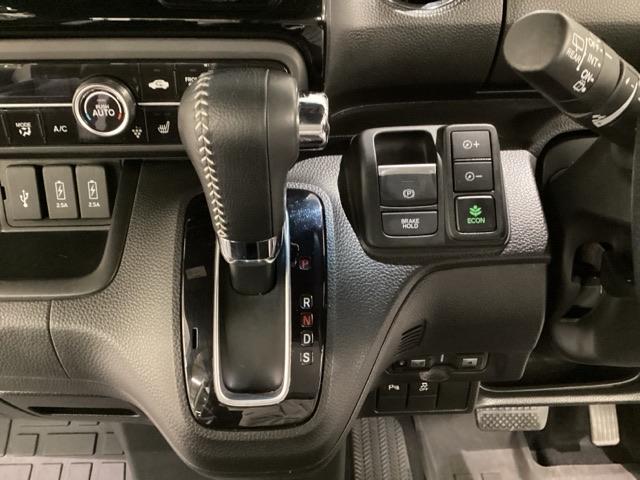 CVT車のセレクトレバーです。低速から高速まで、変速ショックのないスムーズな走りと、エンジン効率のよい領域を維持して燃費にも貢献します。サイドブレーキはスイッチ操作の電子制御パーキングブレーキです。