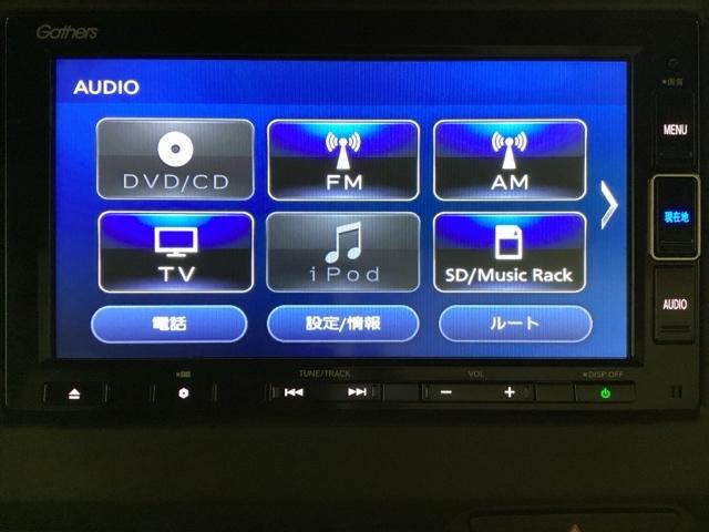 ナビゲーションはフルセグTV、インターナビ対応のGathers純正メモリーナビを搭載しています。Bluetoothオーディオ機能がありますので、スマートフォンなどの音楽も再生できます。