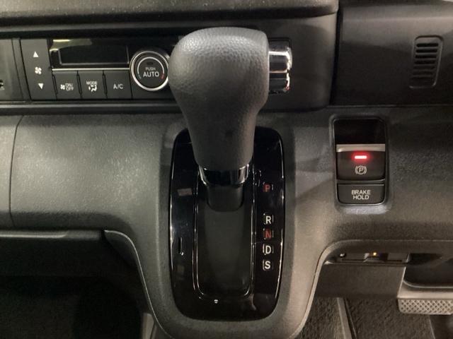 CVT車のセレクトレバーです。低速から高速まで、変速ショックのないスムーズな走りと、エンジン効率のよい領域を維持して燃費にも貢献します。サイドブレーキはスイッチ操作の電子制御パーキングブレーキです。