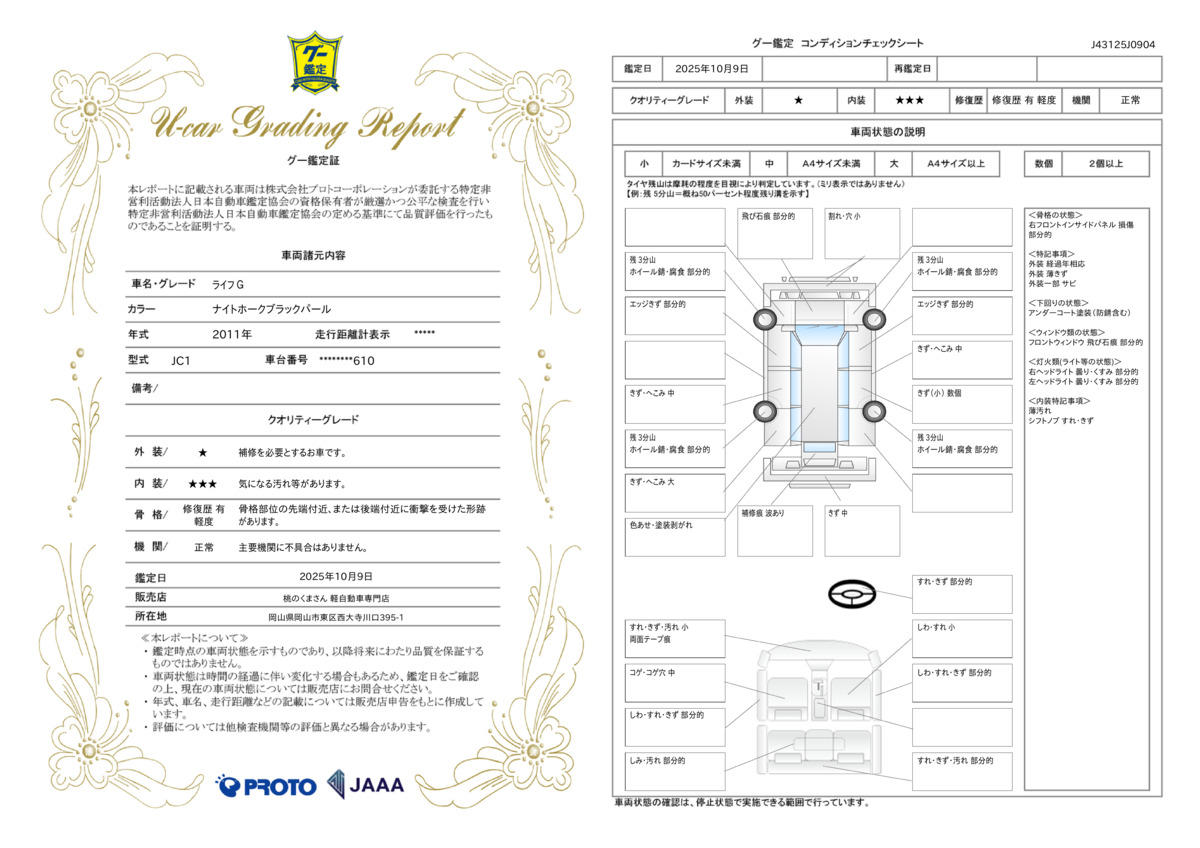 事故歴の有無や内外装の状態、メーターの改ざんの無い証明となります。