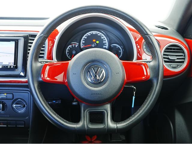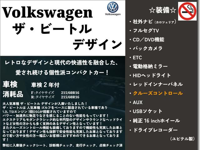 フォルクスワーゲン ザ・ビートルデザイン ボディ同色インテリアパネル・カロッツェリアナビ・フルセグTV・CD.DVD・バックカメラ・ユピテル前方ドライブレコーダー・ETC・クルーズコントロール・HIDヘッドライト・電動格納ミラー・AUX