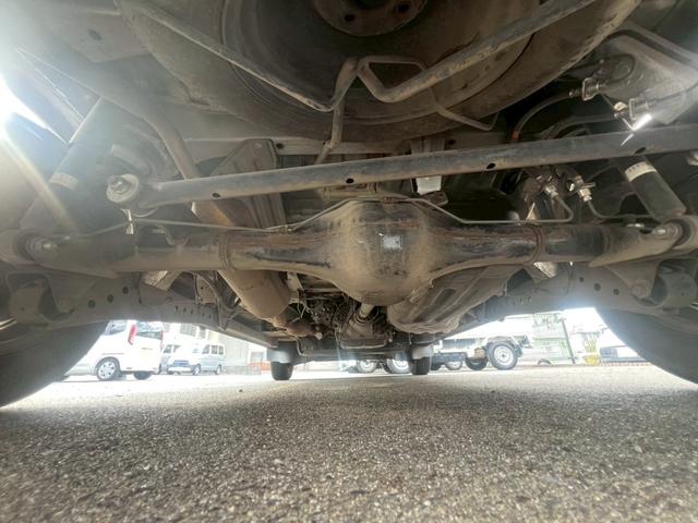 【リア下回り】リア部の骨格に損傷・修理・交換跡がないか、ライトを使用して入念に確認します。合わせて、下回りのサビ・突き上げ等の見えない辛い部分の確認もします。