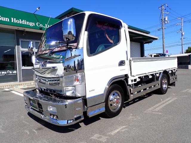 平成25年式のキャンター・平ボディ(1.5t積)です。様々な装飾を多数施した、かっこいい車両です。車検もあり、フロントバンパー可動式なので様々な場面で活躍してくれる即戦力車両です。
