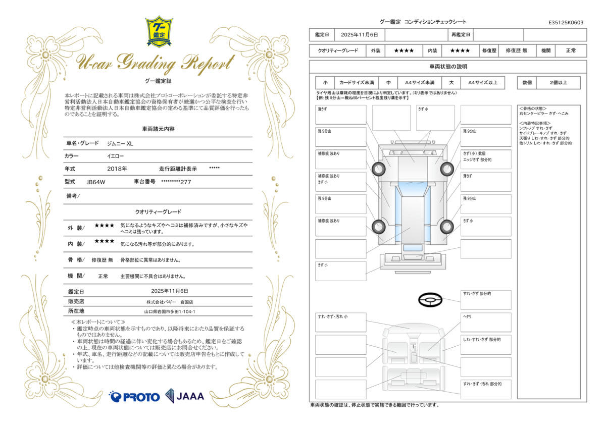 JAAA(日本自動車鑑定協会)による厳しいチェックによりグー鑑定書を開示しております。当社販売担当者、仕入担当者、リフトに持ち上げ車検検査員による下廻りチェックをクリアした高品質車を展示しております