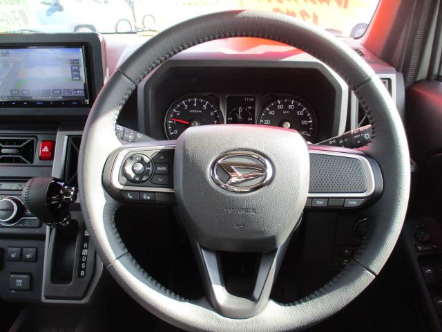 革巻きのハンドルで高級感があります♪オーディオ操作できるステアリングスイッチも付いてます♪