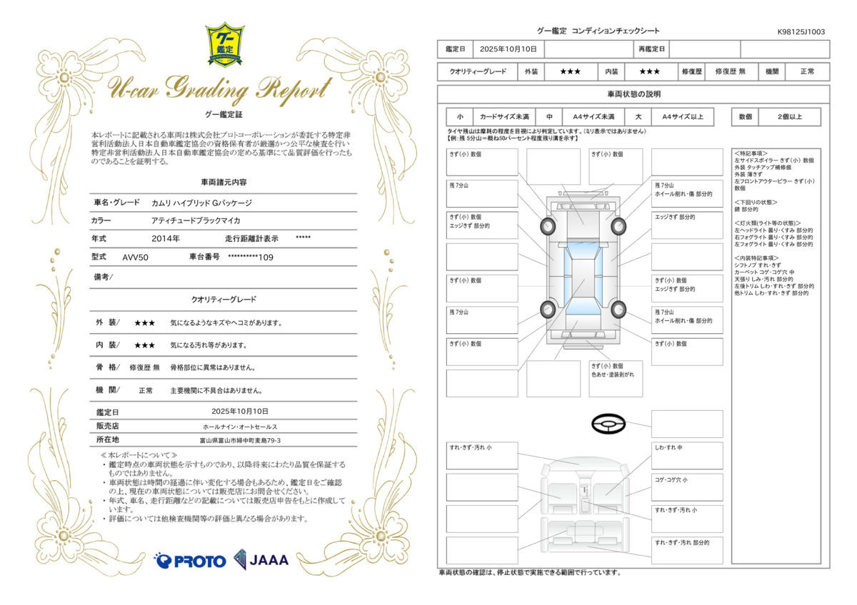 商品車には第三者機関「JAAA」による鑑定証を発行しております。不安なく安心・安全に努めています。