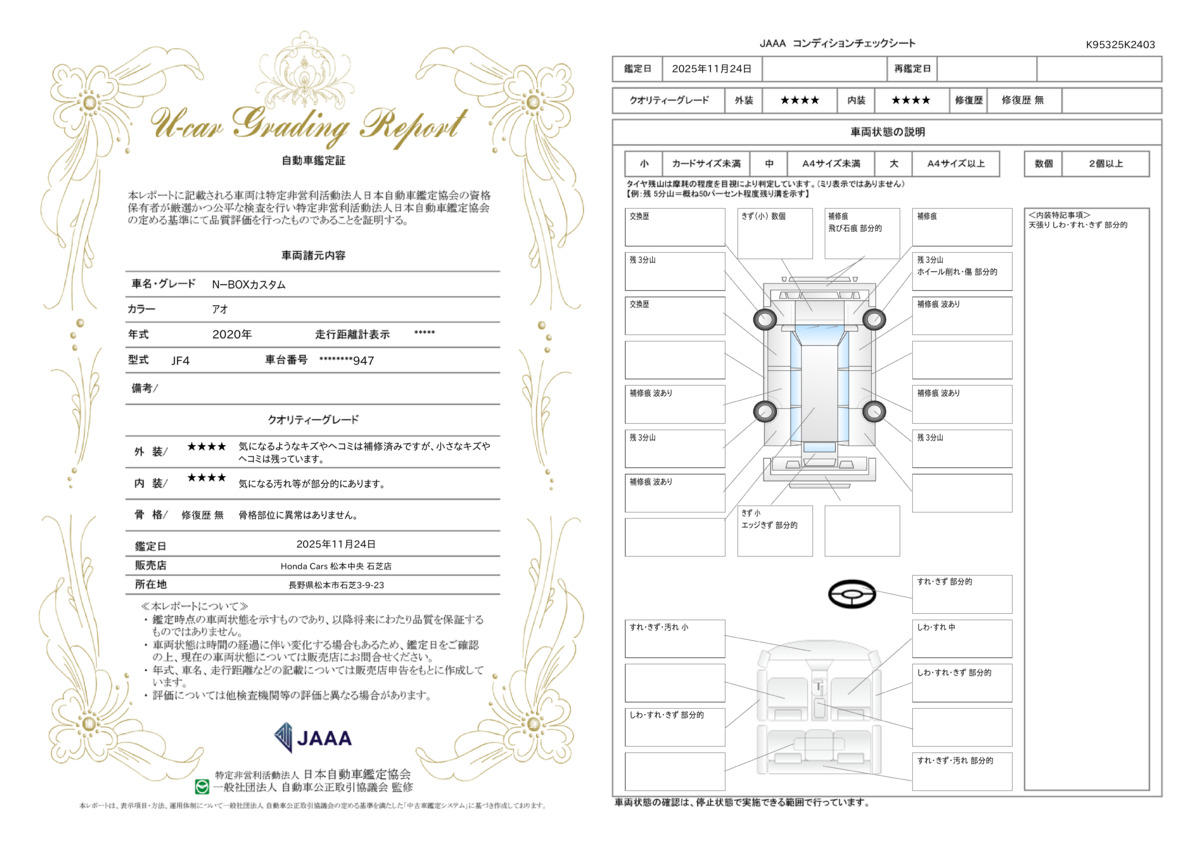 車両状態証明書付き車両です。車両状態を検査員が評価をし、結果を点数で表示しております。1台1台プロの目で事細かにチェックしている車両ですので、ご安心してお買い求めしていだけます。