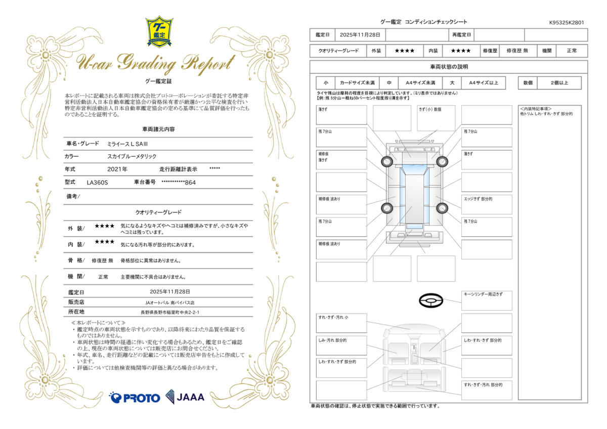当店の展示車はグー鑑定を実施しております!第3者機関のJAAA(日本自動車鑑定協会)の鑑定師が1台1台修復歴の有無や現在の車両状態をチェックしています!※未実施の車両もあります。