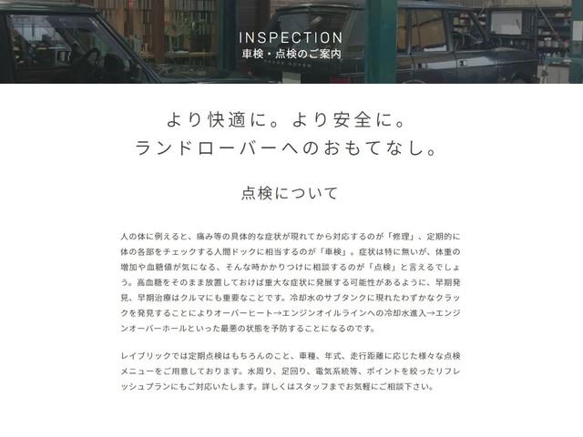 販売する中古車は電球1個に至るまでの全パーツを3ヶ月間保証。ディフェンダーからレンジローバーまで全LR車種お任せ下さい。年式ごとに異なる様々な対応力こそレイブリック最大の財産です。