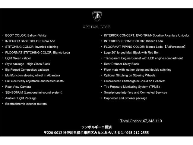 内容 | 保証付:販売店保証 保証期間:1年 保証距離:100,000km【Lamborghini新車保証継承】期間:初回車検時まで有効 距離:100,000Km以内 |