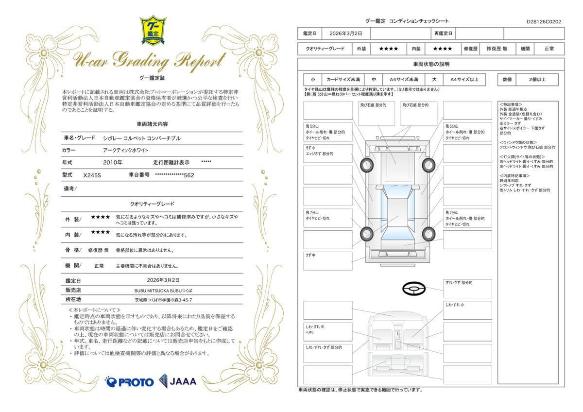 当社在庫車はJAAA並びにAISによる車両鑑定を受けており、当社が設ける厳しい自社基準と併せて、修復歴となる車両は取り扱いません。お客様にご満足頂けるカーライフのために妥協することはありません。(