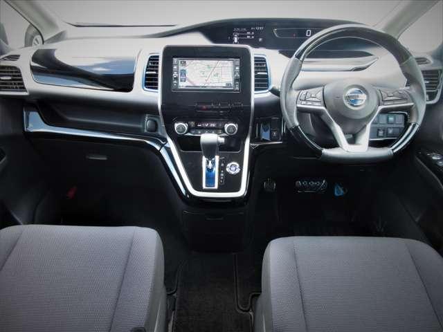 ディーラーオプションのメモリーナビ・ETC・クルーズコントロール・オートエアコン・インテリジェントキー等を装備する運転席まわり。