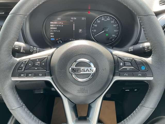 「ステアリングS/W」右【プロパイロット】高速道路で、アクセル、ブレーキ、ステアリングをクルマがアシストいたします。ステアリングS/W左・オーディオのチャンネルやボリュームを手元で操作できます。