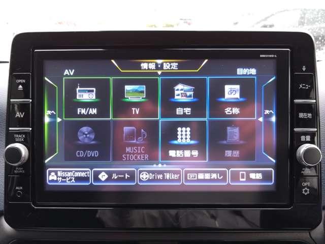 通信ユニット内蔵の日産純正メモリーナビ(MM319D-L)装備、音声対話検索やスマホアプリと連動などに対応した高機能ナビ。高精細液晶による高画質、多彩なメディア再生にも対応しています。