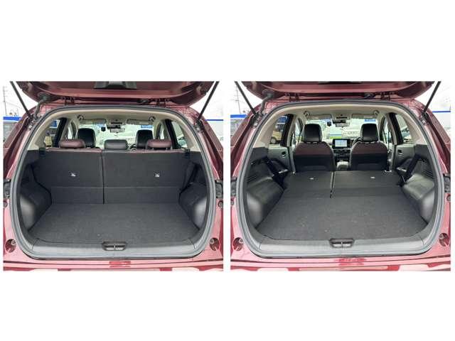 通常時でも、広々とお使い頂けるスペースが確保されています!後部座席を倒すと、もっと広い空間に変わります!長物も余裕で積み込むことができますよ!