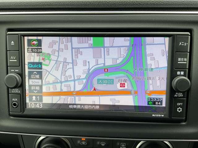 日産純正メモリーナビ(MJ121D-W)装備。便利な音声対話検索にくわえ、アプリで情報取得や動画視聴にスマホ活用対応、快適な画面操作と高音質なオーディオ再生。