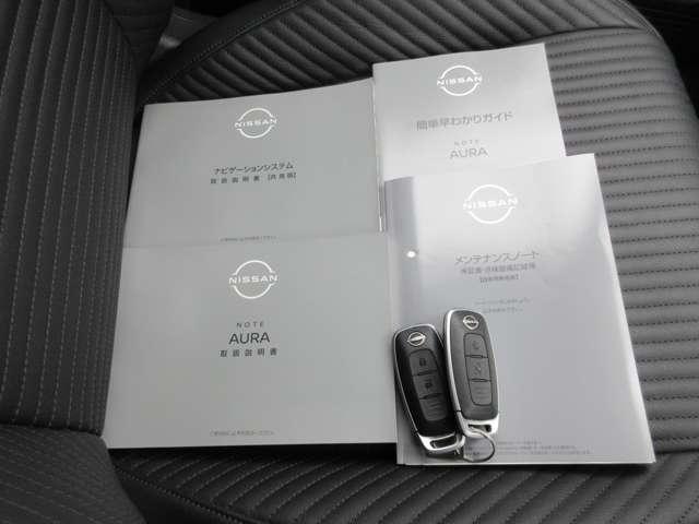 整備手帳やナビゲーションの説明書付きです。盗難防止装置のイモビライザーを装着しているリモコンキー付きなので、バックに入れたままでもドアロックやエンジン始動をしていただくことができます。
