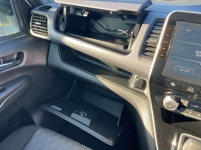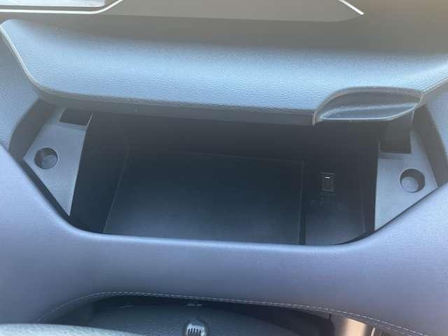 運転席前に便利な小物入れが付いています。右側には、USB充電ポートが付いてます。別売りのケーブルを接続して、充電などにご利用下さい。