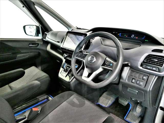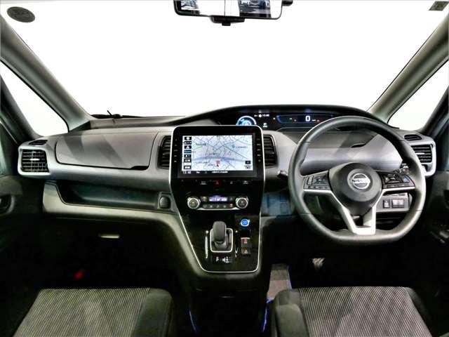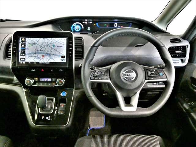 大型モニター式ナビゲーションを見やすい位置に配置して視点の移動を抑えて操作性をアップした運転席周りです♪