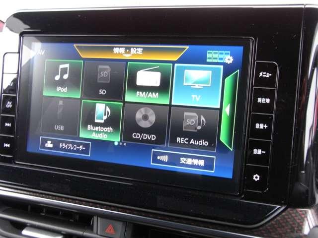 純正9インチ大画面ナビはナビゲーション+AV 2画面表示、Bluetooth Audio、SDカード、DVD再生、CD再生/CD録音、地デジTV、ラジオ、スマートフォン連携、ハンズフリーフォン対応の高