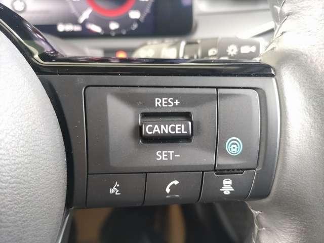 高速道路単一車線の運転支援機能、「プロパイロット」のステアリングスイッチ。一般道では先行車追従機能のアダクティブ クルーズコントロールのみご使用頂けます。