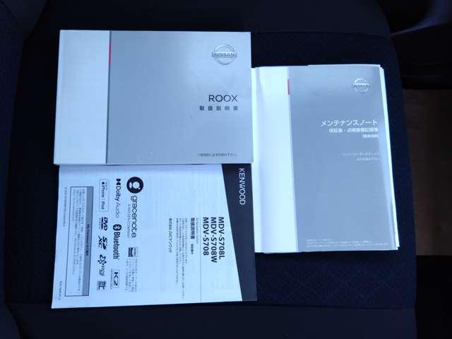 取り扱い説明書、保証書そろっています。おクルマの点検整備や保証内容がきちんと記録されているから安心です。