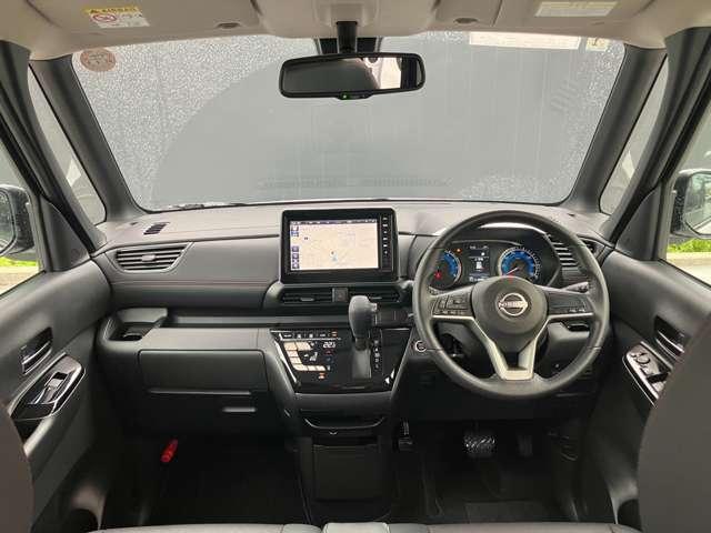 ブラック系の落ち着いた内装とウィンドガラスが大きく視認性の良いフロント周りで、運転がし易いと好評です♪