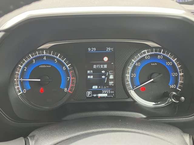 左にタコメーター右にスピードメーターを配置。オーソドックスなレイアウトで見やすいメーターです。メーター中央部に車両状態確認、安全装備の確認設定が行える液晶ディスプレイを装備しています。