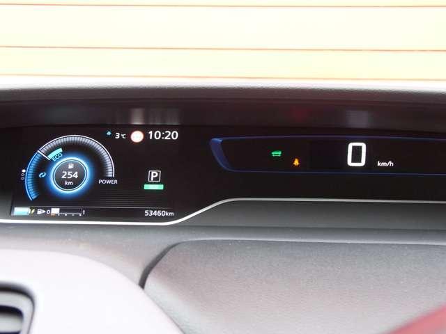 スポーティなアドバンスディスプレイメーターは、各種燃費表示機能、バッテリー残量、トリップメーター、デジタル時計、航続可能距離などが表示されます。
