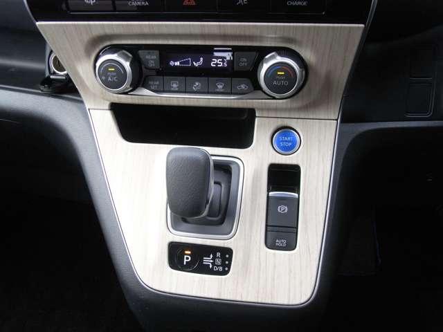 e-POWER専用シフトレバーです。加速も減速もペダル1つで可能な驚きのワンペダルドライブ!ノーマル、S、ECOの3つのモードを状況に応じて選択できます。木目調パネル付です。