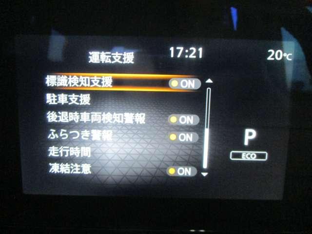 標識検知支援、駐車支援、後退時車両検知警報、ふらつき警報、走行時間、凍結注意)等の設定が出来ます。
