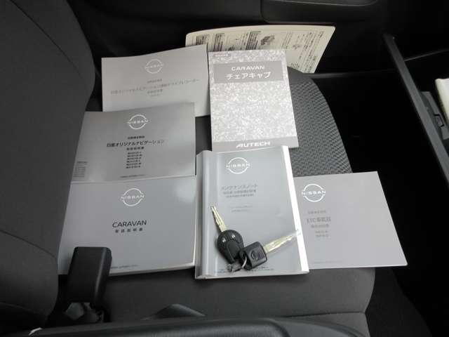 整備手帳やナビゲーションの説明書付きです。盗難防止装置のイモビライザーを装着しているリモコンキー付きなので、バックに入れたままでもドアロックやエンジン始動をしていただくことができます。