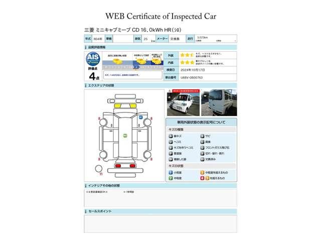 第三者評価機関「AIS社」の車両検査済み!総合評価4点(評価点はAISによるS〜Rの評価で令和7年1月現在のものです)です。駆動用バッテリー残存率測定済み(101.0%)☆