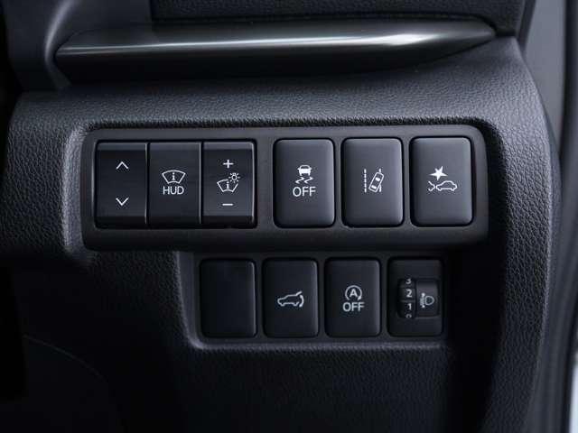 各種機能類のスイッチです!ヘッドアップディスプレイの角度や明るさの調整スイッチの他、横滑り防止装置やレーンキープアシスト等の運転支援機能のオン/オフスイッチもございます!