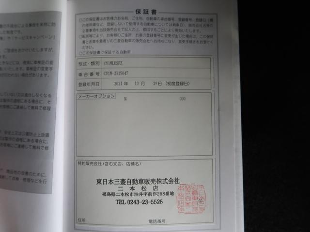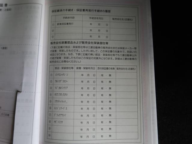 | 内容 | 1年走行距離無制限保証全国の三菱自動車ディーラーで使える、1年間の無料保証付きです。(消耗品、油脂類、ボデー内外装部品は対象外になります)さらに有料で2年間の延長が可能です。 |