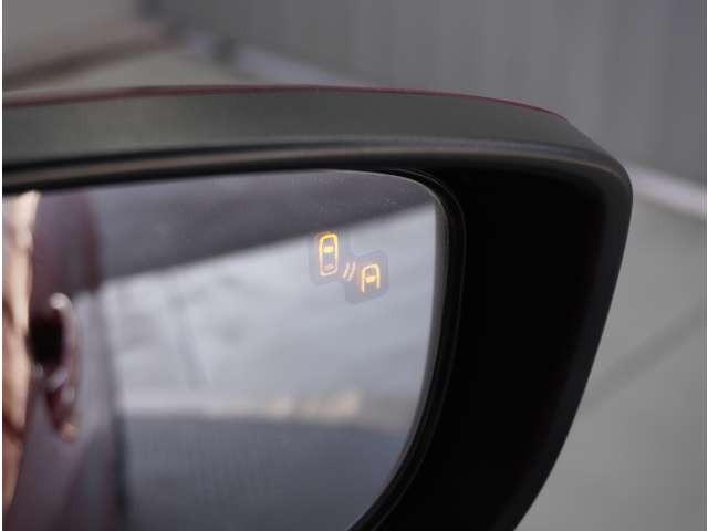 【ブラインドスポットモニタリング】走行中、ドアミラーの死角になりやすい箇所に後続車が接近するとサイドミラーのレンズに警告を表示。ドライバーに注意喚起をしてくれます。