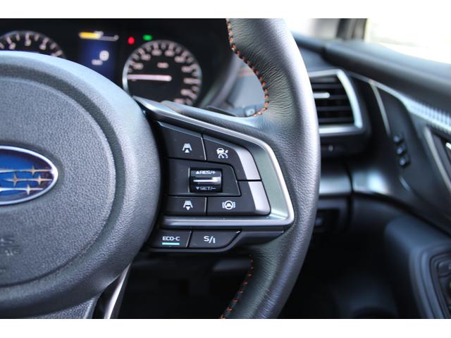 ステアリングスポーク右側に「全車速追従クルーズコントロール」のスイッチがあります、スバルのシステムは停止から高速域まで前車を追従できます、高速巡行だけでなく渋滞時も使えて便利、レーンキープ機能付き