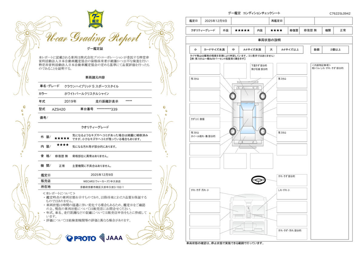 トヨタ クラウンハイブリッドSスポーツスタイル 新品タイヤ/保証書/純正 9インチ SDナビ/トヨタセーフティセンス/シートヒーター 前席/パノラミックビューモニター/車線逸脱防止支援システム/シート ハーフレザー/ドライブレコーダー 前後 ETC